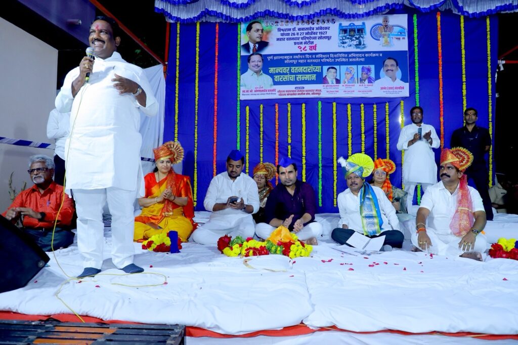 महिलांच्या भावना आहे त्या आणि अजून एक विषय साहेब नगरसेवक असताना तर रमाई घरकुल आवास योजना सगळ्यांना मिळाली पण आता महापालिकेने पत्र पाठवले उतारा मागत आहेत. या वस्तीमध्ये एक सुद्धा पत्र्याचे घर नाही राहिले पाहिजे. सोलापूर महानगरपालिकेचे मा. आयुक्त यांच्याबरोबर बैठक घेऊन हा विषय मार्गी लावा. यावेळी महाराष्ट्र राज्याच्या विधानसभेचे उपाध्यक्ष मा.ना.श्री.अण्णा बनसोडे यांनी व्यक्त करताना म्हणाले डॉ.बाबासाहेब आंबेडकर यांच्या २६ व २७ नोव्हेंबर १९२७ महार वतनदार परिषदेच्या सोलापूर प्रथम भेटीस आज वर्षे ९८ वर्षे पूर्ण झाल्याबद्दल वर्धापन दिन व संविधान दिनानिमित्त अभिवादन कार्यक्रम आयोजित करण्यात आला. महार वतनदार परिषदेसाठी भारतरत्न डॉ. बाबासाहेब आंबेडकरांसोबत त्यावेळी त्यांचे सहकारी उपस्थित होते. त्यांचे आज नातेवाईक या ठिकाणी उपलब्ध आहेत त्या नातेवाईकांचा सत्कार आनंद दादा चंदनशिवे यांच्या वतीने या करण्यात आला. विश्वरत्न डॉ. बाबासाहेब आंबेडकरांनी या देशाला संविधान दिले न्याय समता बंधुता स्वातंत्र्य ह्या मूलभूत आधारावर खरंतर हे संविधान दिले आज आपण या पवित्र ठिकाणी जो हा कार्यक्रम घेतलेला आहे. आनंद दादांनी सांगितल्याप्रमाणे खरोखरच आहे तुम्ही आम्ही खूप भाग्यवान आहोत ज्यांच्या पदस्पर्शाने ही भूमी पावन झाली त्या भूमिती आजचा हा कार्यक्रम होत असताना तुम्हाला आणि माझ्यासारख्या सर्वसामान्य कार्यकर्त्याला नक्कीच आनंद वाटण्यासारखा आजचा दिवस आहे. राजकारणामध्ये काम करत असताना सत्कार समारंभ सोहळे होत असतात पण आनंदरावाचा हा जो कार्यक्रम तुम्ही या ठिकाणी आयोजित केला हा आयुष्यातला सर्वात अतिशय चांगला आणि लक्षात राहणारा हा कार्यक्रम आणि आजचा दिवस असणार आहे आपण या परिसरामध्ये सलग पंधरा वर्षे सोलापूर महानगरपालिकेची निवडणूक लढवून आपल्या या मिलिंद नगर परिसरामध्ये समाजाच्या दृष्टिकोन असणारे समाजाचे महत्त्वाचे आणि मूलभूत असे प्रश्न सोडवण्याचे काम आपल्याकडं यापूर्वी केले गेलेले आणि पुढील काळातही केले जाईल असं मला ठाम विश्वास आहे. पंचाची चावडी व अस्थिविहार स्मारक व्हावे मराठवाडा विद्यापीठ कमानीचे काम मंजूर करण्यात यावे ह्या कामासाठी आनंद भाऊ तुमच्याकडून आणि तुमच्या सर्व सहकार्याने गेले अनेक दिवसापासून प्रयत्न चालू आहे भारतरत्न डॉ. बाबासाहेब आंबेडकरांच्या संविधानामुळे मला आज महाराष्ट्रामध्ये महाराष्ट्र विधानसभेचा उपाध्यक्षपदी काम करण्याची खऱ्या अर्थाने संधी मिळालेली बाबासाहेबांचा आपल्या सर्वांवर असलेले ऋण फेडण्याच्या उद्देशानेच आपण ज्या या दोन मागण्या केलेल्या त्यातील महत्त्वाची मागणी पंचाची चावडी आणि विश्वरत्न बाबासाहेब आंबेड