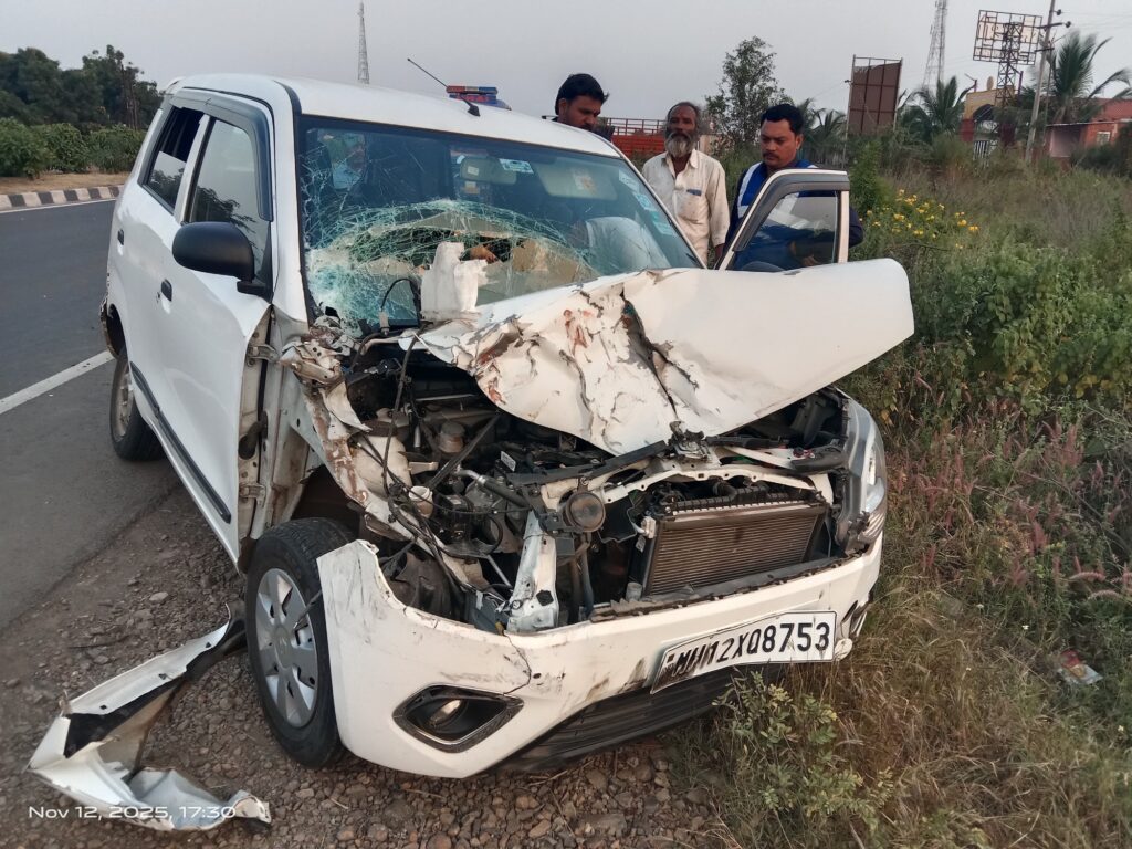 सोलापूर – दिनांक १२ नोव्हेंबर २०२५ रोजी सायंकाळी पाच वाजण्याच्या सुमारास सोलापूर पुणे महामार्गावर तेलंगवाडी गावाजवळ सोलापूर वरून पुणे येथे जात असताना भरधाव वेगाने जाणाऱ्या व्हॅगनार कार क्रमांक MH 12 XQ 8753 चे पुढील टायर फुटल्याने कारचालकाचे कारवरील नियंत्रण सुटल्याने कार अनियंत्रित होऊन बेंगलोर वरून मुंबई येथे जाणाऱ्या एका आयशर टेम्पोला पाठीमागून जोरदार धडक देऊन झालेल्या अपघातात कारचालकाच्या बाजूला बसलेल्या एका महिलेच्या डोक्याला जबर मार लागून गंभीर जखमी झाली तर अन्य चार जण किरकोळ जखमी झाले.